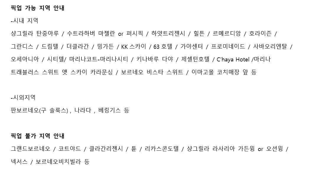 ▶ 위치, 거리 특성 상 시내지역 및 시외지역 픽업만 가능하며 원보르네오 & 외곽지역 픽업은 불가합니다.