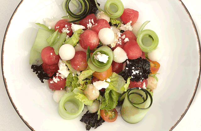 에피타이저 : 워터멜론 샐러드, 구운 토마토 & 피망 스프